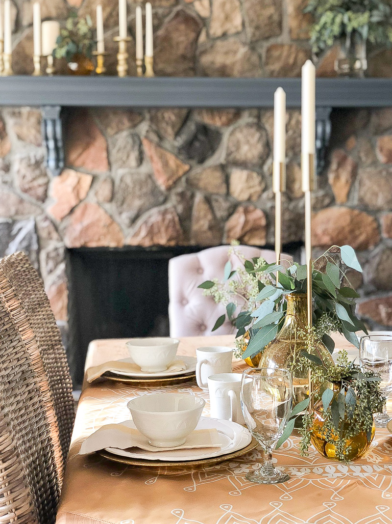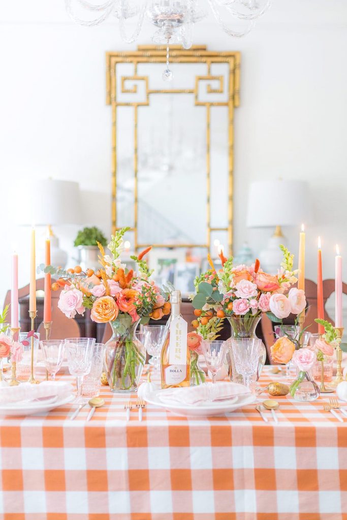 This light and bright tablescape is the perfect setting to enjoy meals throughout the entire fall-iday season! The gingham style tablecloths and napkins paired with the fresh flowers are the perfect setting for pleasant family meals.